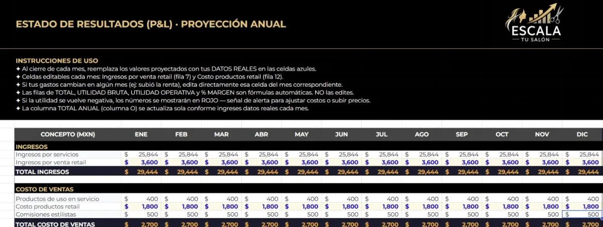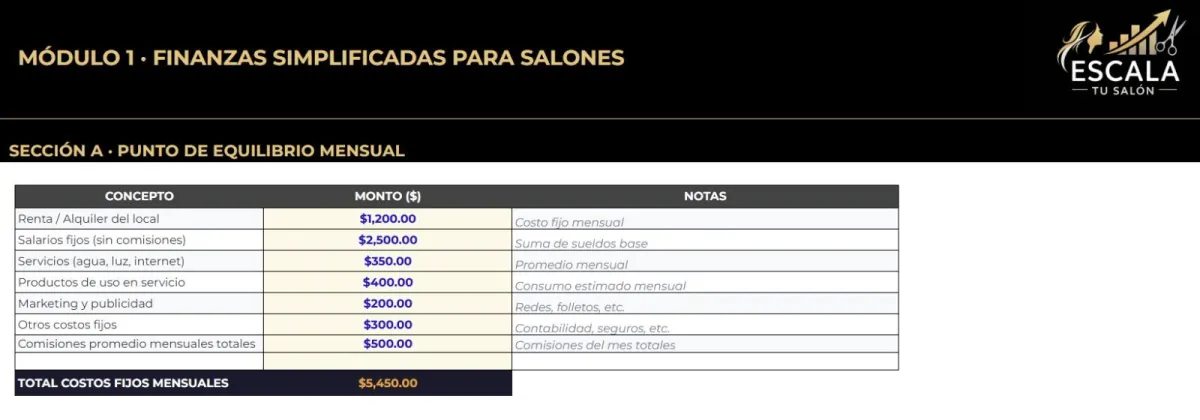 Punto de equilibrio + meta diaria por estilista + rentabilidad real por servicio + scripts comerciales (rebooking/upsell/retail) + dashboard por estilista. Todo en un sistema listo en Google Sheets con plan de 4 semanas.